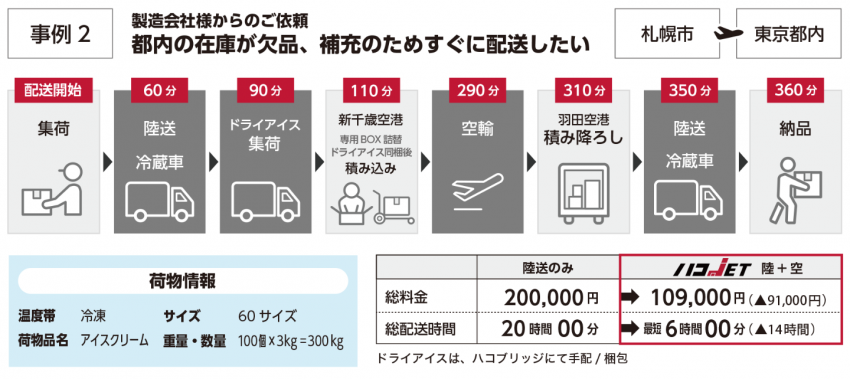 事例2. 札幌市→東京都内「都内の在庫が欠品、補充のためすぐに配送したい」