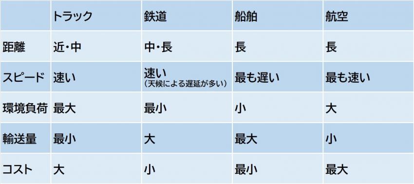 トラック、鉄道、船舶、航空の特徴を下表にまとめました。環境負荷の大きいトラックから、環境負荷の小さい鉄道、船舶へのモーダルシフトが急務です。