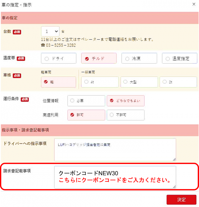 ・陸送料金の値引き反映は運行完了後に「注文履歴」からご確認ください。