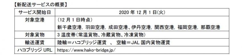 日本航空株式会社(本社:東京都品川区、代表取締役社長:赤坂 祐二、以下「JAL」)と株式会社ルーフィ(本社:東京都中央区、代表取締役社長:渡辺 泰章、以下「ルーフィ」)は、2020年12月1日より、国内主要7空港と全国の陸路をつなぐ、空陸一貫の新配送サービスの提供を共同で開始します。新配送サービスは、ルーフィが運営するビジネス便に特化した配送のマッチングシステム「ハコブリッジ」の一機能「ハコJET」として提供します。