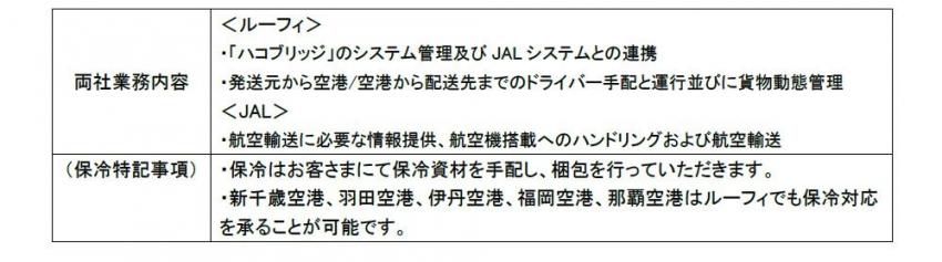 これまで航空貨物輸送をご利用いただく場合、空輸の手配と空港間以外の陸輸をお客さまにて別々に手配する必要がございました。本サービスの導入により、JALが有する国内線ネットワークとルーフィの荷主をつなぐ空陸一貫物流を実現し、遠距離でも「時間を指定できる“国内初”の3温度帯の当日配送マッチングサービス」という新たな価値を両社にて創造、提供します。