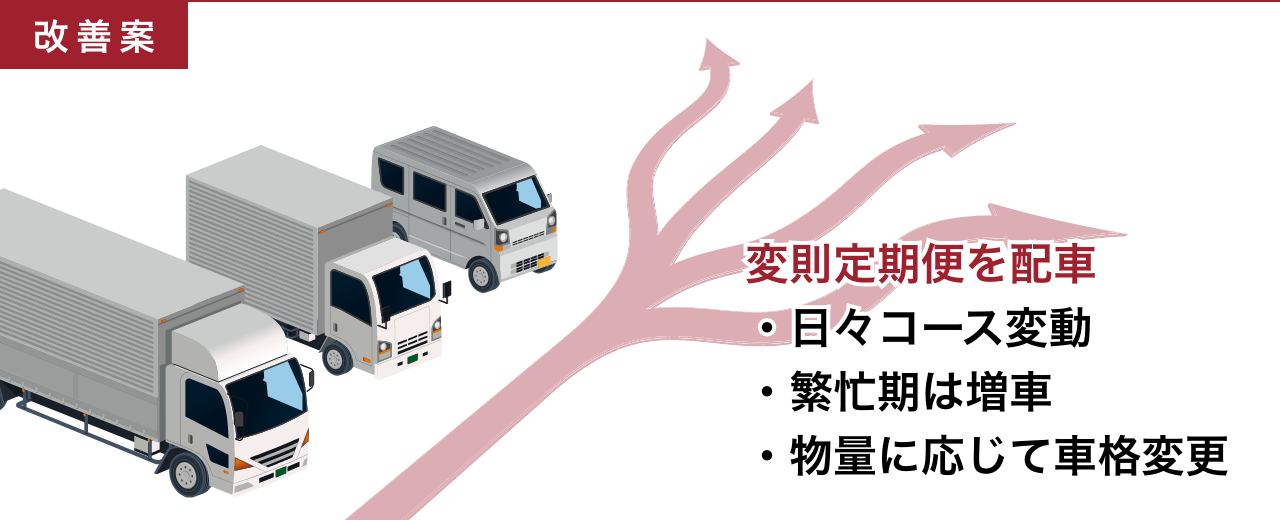 - 定期便(コース固定)の他に変則定期便(日々コース変動)を配車